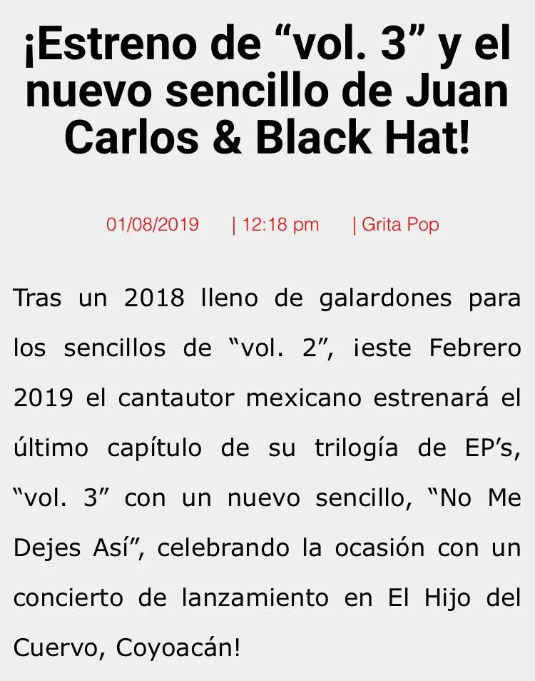 ¡Estreno de "vol. 3" y el nuevo sencillo de Juan Carlos & Black Hat!